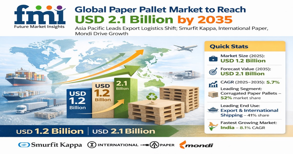 NEWARK , DE, UNITED STATES, April 1, 2026 /EINPresswire.com/ -- The global paper pallet market is valued at USD 1.2 billion in 2025 and is projected to reach USD 2.1 billion by 2035, expanding at a CAGR of 5.7% over the forecast period. This growth trajectory reflects a structural shift in global logistics—from heavy, rigid pallet systems toward lightweight, recyclable, and export-optimized alternatives. Rather than incremental adoption, the market is undergoing a transformation driven by cost-per-shipment optimization, regulatory compliance, and automation compatibility, positioning paper pallets as a strategic procurement lever rather than a commodity input.