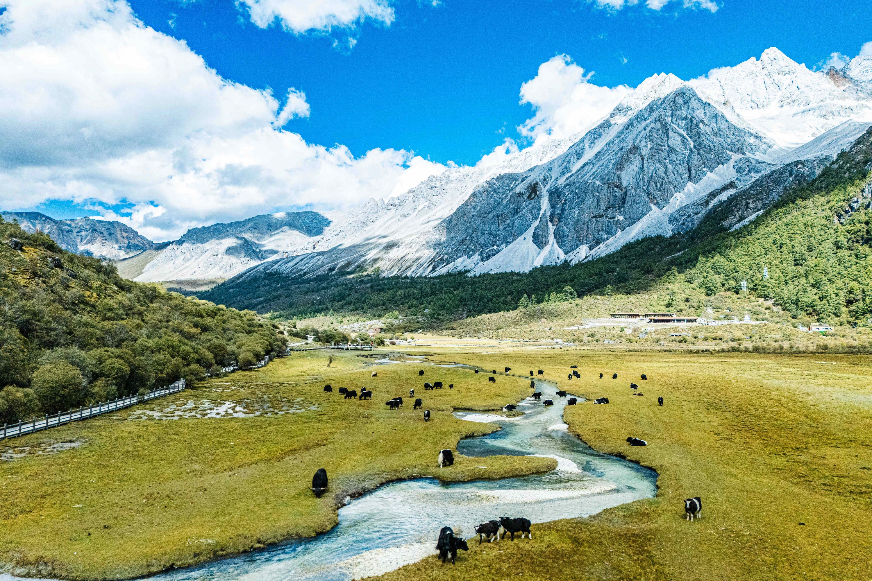 Daocheng Yading, which means "Land Facing the Sun" in Tibetan, is honored as the Last Pure Land on the Blue Planet and hailed as the Soul of Shangri-La in China. Blessed by nature, this sacred land is dominated by three snow-capped mountains—Xiannairi, Yangmaiyong, and Xianuoduoji—standing majestically in a triangular formation, their summits permanently capped with snow. Meltwater feeds alpine lakes with crystal-clear and azure blue water, including Milk Sea, Five-color Lake, and Pearl Lake. At the foot of the mountains stretch endless forests, lush pastures, and winding streams across the Luorong Pasture—where the most breathtaking scenery of the snow-covered highlands converges in one place.