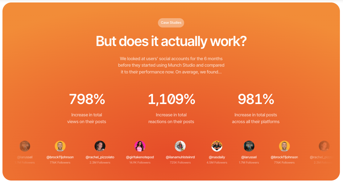 The video suite is the newest addition to a broader AI content system that manages a business's full social media presence. Munch Studio's AI content creation engine generates platform-specific text posts, captions, and content strategy automatically, keeping channels active with relevant material between video uploads. The AI learns the business's niche, tone, and audience from the website at setup and continues refining its output based on user feedback over time.
