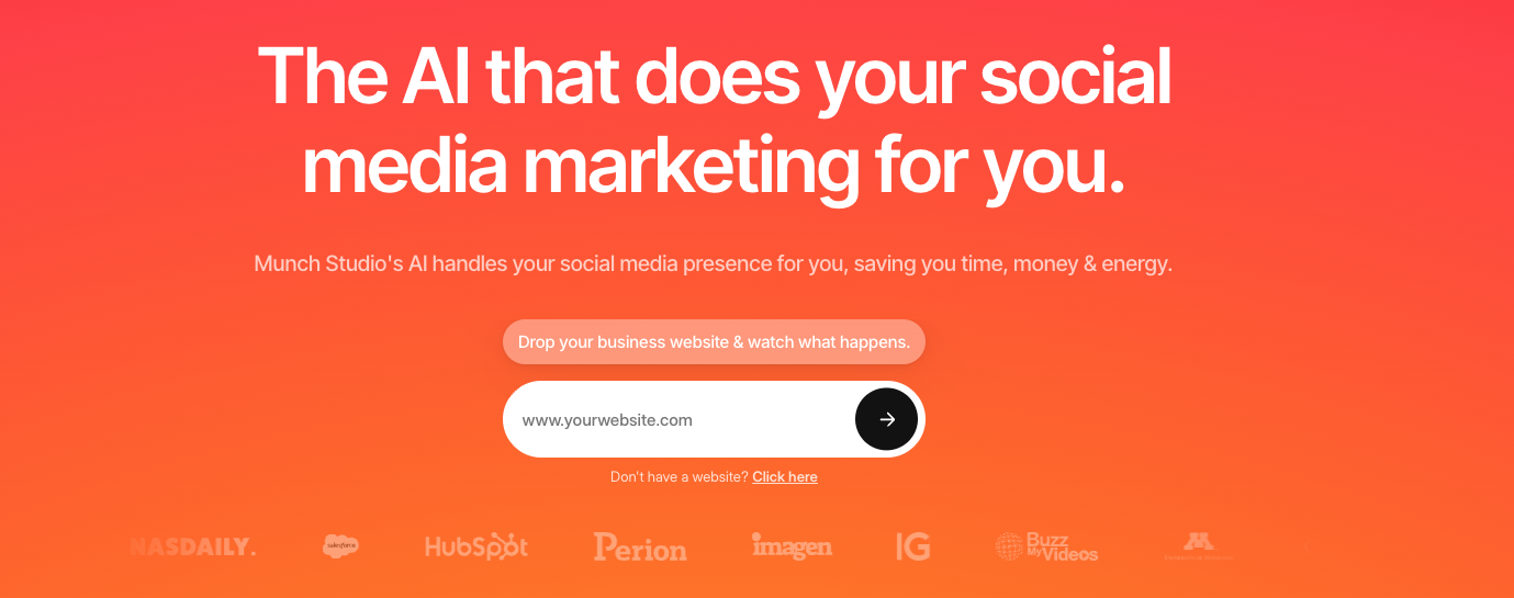 Munch Studio is built differently. When a user creates an account, they enter their business website URL. The platform reads the site to learn the business's industry, services, target audience, brand voice, visual identity, color palette, and logo. Everything the platform produces — including video clips, captions, written posts, and content strategy recommendations — reflects the specific brand identity of that business.